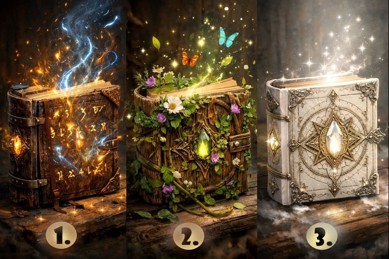 Auf dem Bild sehen wir drei uralte Bücher – jedes von ihnen lebendig, mystisch und von eigener Kraft durchzogen. Gemeinsam erzählen sie eine Geschichte darüber, wie Ziele entstehen, wachsen und schließlich verwirklicht werden.
