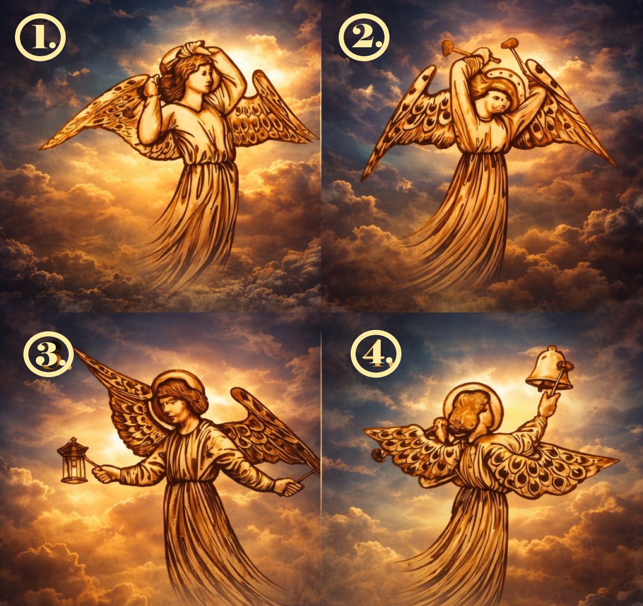 Manchmal fühlen wir, dass das Universum oder eine höhere Kraft versucht, uns eine Botschaft zu senden. Viele Menschen glauben, dass Schutzengel uns im Leben begleiten und uns durch Zeichen, Gefühle oder Intuition Hinweise geben. Dieses Bild zeigt vier verschiedene Engel – jeder von ihnen trägt eine besondere Energie und symbolisiert eine andere Botschaft für deine Zukunft.