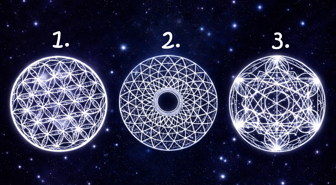 Das Bild zeigt drei mystische geometrische Formen. Jede von ihnen trägt eine besondere Symbolik. Oft fühlt sich ein Mensch spontan von einer dieser Formen stärker angezogen als von den anderen. Interessanterweise kann diese intuitive Wahl etwas über die eigene Persönlichkeit verraten.