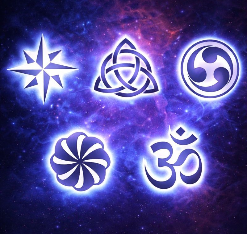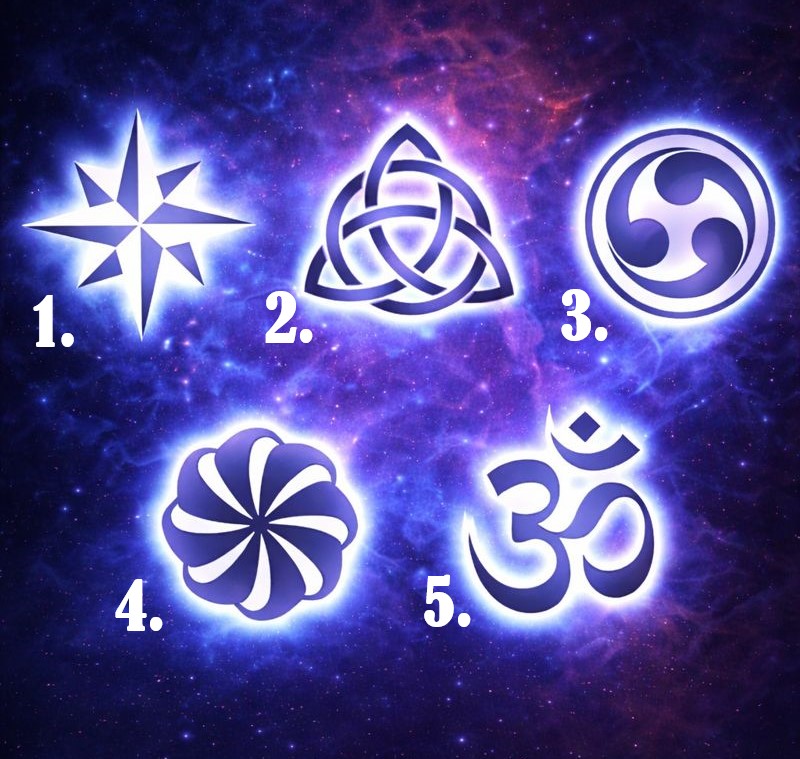 Das Bild zeigt fünf uralte Symbole, die aus verschiedenen Kulturen und Zeiten stammen. Jedes von ihnen steht für einen bestimmten Bewusstseinszustand und eine innere Entwicklung.